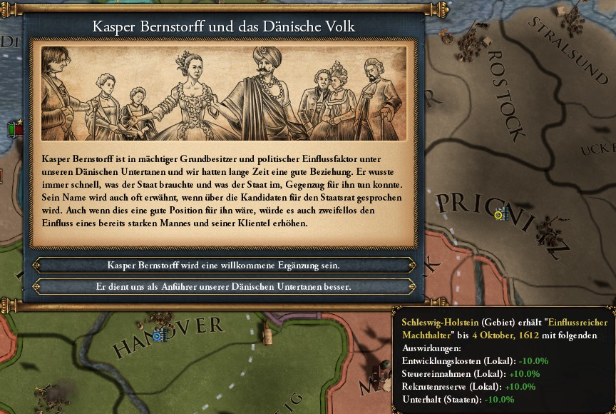 Ein einflussreicher Grundbesitzer hebt sich in unter der dänischen Bevölkerung hervor. Wir nutzen die Gunst der Stunde und setzen ihn als Anführer für unsere dänischen Untertanen ein.