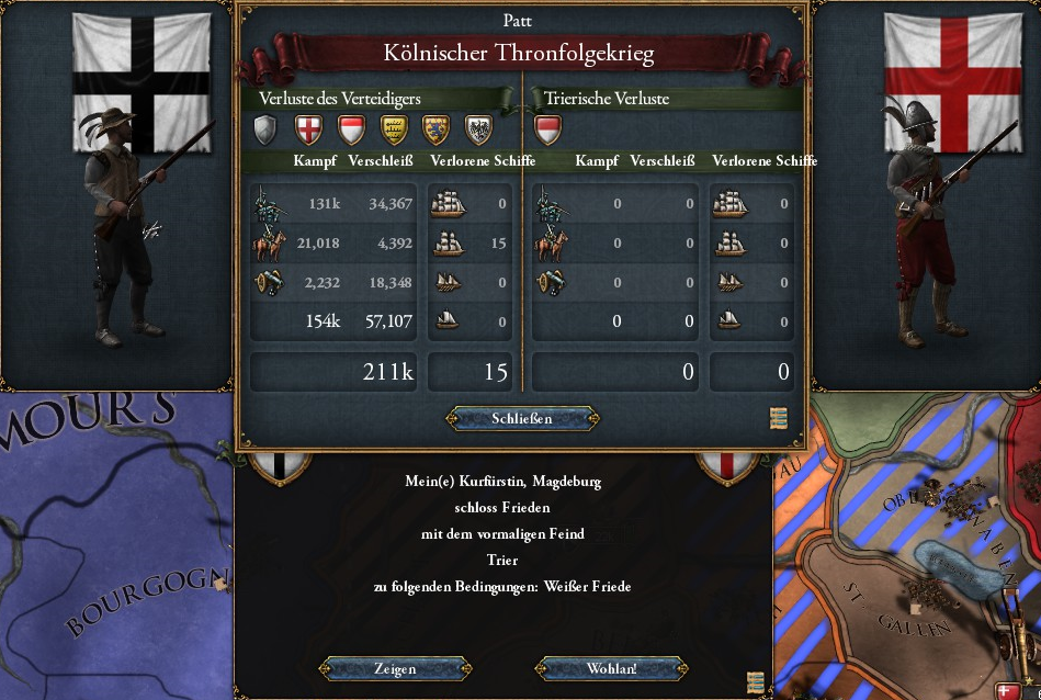 Im Jahre 1601 greift uns das ehemalige Bistum Magdeburg gemeinsam mit seinem Verbündeten aus Trier, sowie den Reichsstädten Bremen, Hamburg und Lübeck erneut an. Dies ist der zweite Konflikt mit Magdeburg nach den Religionskriegen. Sowohl der Kirchenstaat als auch Schweden ehrten ihr Bündnis mit uns und stiegen ebenfalls in den Krieg ein. Es folgten fünf Jahre voller Verwüstungen, welche auf beiden Seiten einen hohen Blutzoll forderten. Über 300.000 Soldaten sollten am Ende des Konflikts nicht mehr nach Hause zurückkehren. Mehrere große Schlachten wurden geschlagen, welche stets auf Messerschneide standen, aber dann dank Gottes Hilfe von der katholischen Seite gewonnen werden konnte. Schließlich kapitulierten Magdeburg und seine Verbündeten und akzeptierten die Friedensbedingungen, welche beinhalteten, dass die Ansprüche Kölns zur Einigung der Niedersächsischen Kultur Rechtens und unumstößlich waren.