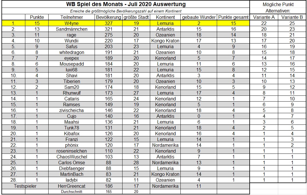 Einfach nur Siedeln hat vielen Spaß gemacht und ich hoffe viele Namen auch in den kommenden „Spiel des Monats“ Einsendungen zu lesen. Dass es schließlich doch nicht ganz so einfach war, sieht man an den vielen unterschiedlichen Bevölkerungszahlen auf denselben Kontinenten. Für die exakte Auswertung musste sogar zwei Mal die Nebenwertung berücksichtigt werden.