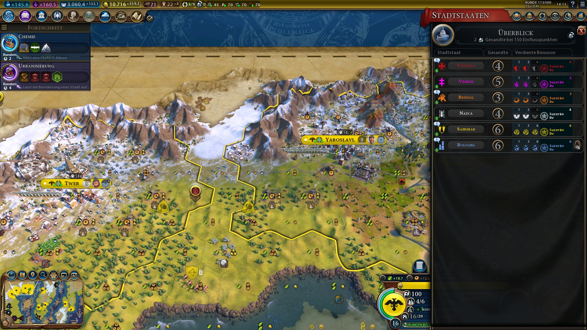 Ich hatte mich damit abgefunden hatte den Panamakanal zu bauen (ursprünglich 100 Runden, da habe ich vorher eine Heilige Stätte mit 14 Nachbarschaftsbonus und damit auch 14 Produktion gebaut, dann war es erträglich zusammen mit etwas Roden). Dann wurde die Stadt mit dem Schwemmland-Kanal von einer großen Flutwelle erfasst (minus ein Bevölkerung, der Handwerker mit 4 Ladungen tot und der gebaute Bauernhof wurde auch Opfer der Flut). Dann kamen meine Militätpioniere an, die konnten am Panamakanal nicht arbeiten und haben dann den Schwemmland-Kanal fertiggestellt und dann direkt noch einen Staudamm zusammengezimmert.