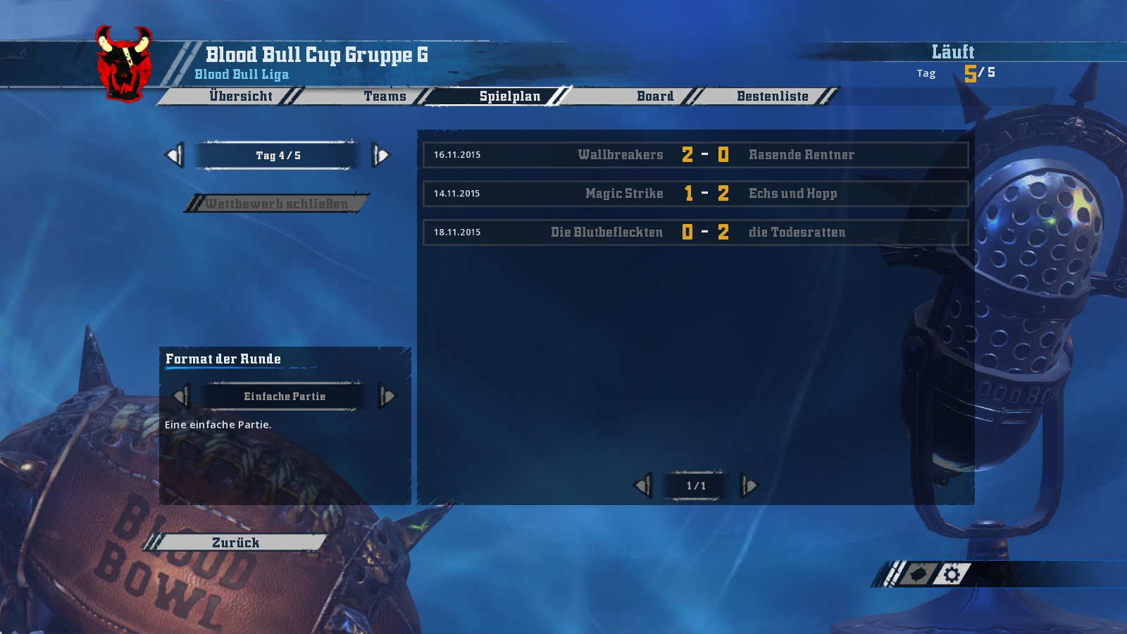 Der letzte Zug von Heinz vom Stein. Ohne zusätzliches Risiko ließ er seinen Ork in Richtung Endzone laufen. Einen Sprint musste er mitnehmen und diesen schaffte er. Erneut hochspannend endete dieses Finale und damit auch der Cup.