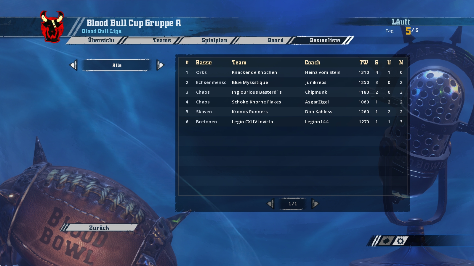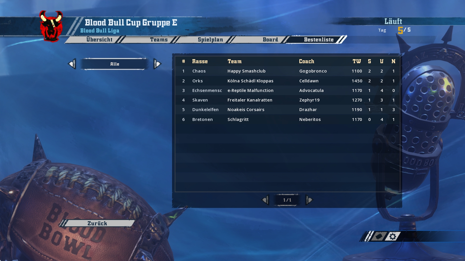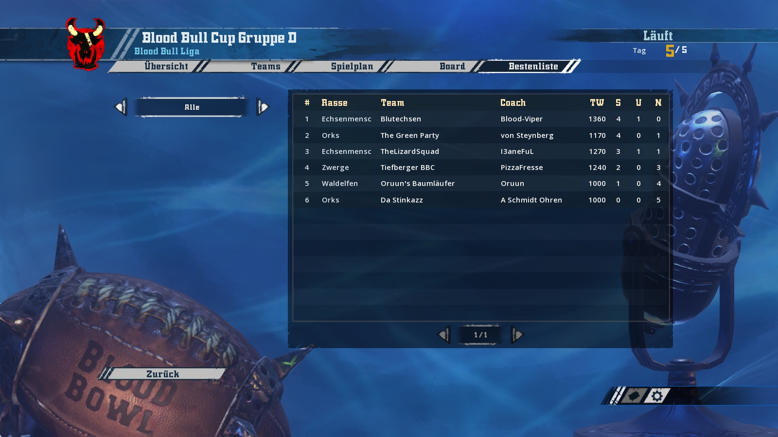 Die Blutechsen (Echsenmenschen) mit ihrem Coch Blood Viper spielten gegen den Happy Smashclub (Chaos) mit ihrem Coach Gogobronco.