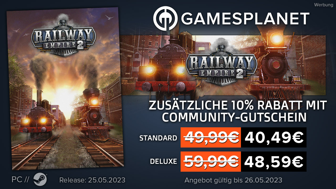 Achtung, ab dem 26.05. fällt der vorgeschaltete Release-Rabatt bei Gamesplanet weg. Dadurch beläuft sich der Gesamt-Rabatt nur noch auf die 10%, die unser Community-Gutschein gibt.