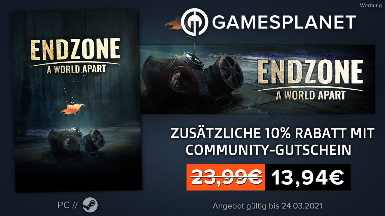 Unser neue Let's Play-Reihe startet heute Abend! Wir spielen den vielgelobten Survival-Aufbaustrategiehit Endzone - A World Apart. Am heutigen Sonntag ab 19 Uhr live auf Twitch!