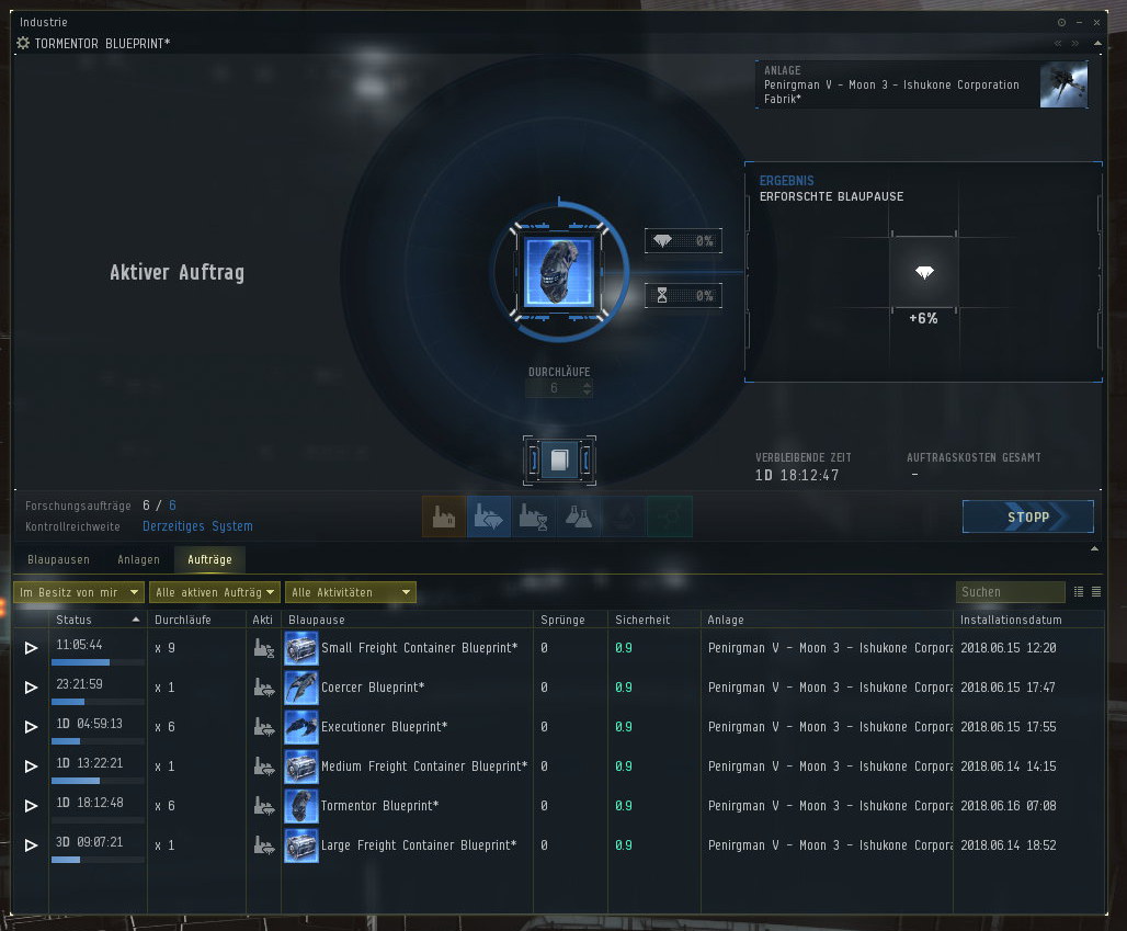 Im Moment werden die Blueprints in Bezug auf Material- und Zeiteffizienz erforscht, dies dauert noch einige Tage danach machen wir uns an die Produktion einer kleiner ausgewogenen Einsatzfflotte, die dann der Corp. für Aktionen zu verfügung steht.
