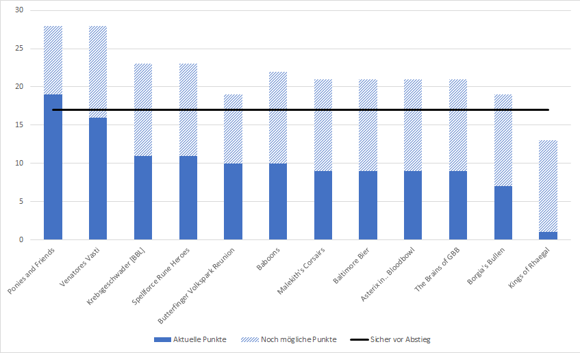 Diese Prognose soll die "Form" der Coaches abbilden. Bei einem Zufalls-basierten Spiel wie Blood Bowl ist das immer mit Vorsicht zu genießen. Dieses Modell sieht dann Largo vor Weasel und erwartet, dass sich die Butterfinger den dritten Platz holen. Absteigen würden dann: Balimore Bier, Asterix in.. Bloodbowl, The Brains of GBB, Borgia's Bullen und Kings of Rhaegal. Somit würden sich die Corsairs retten können.