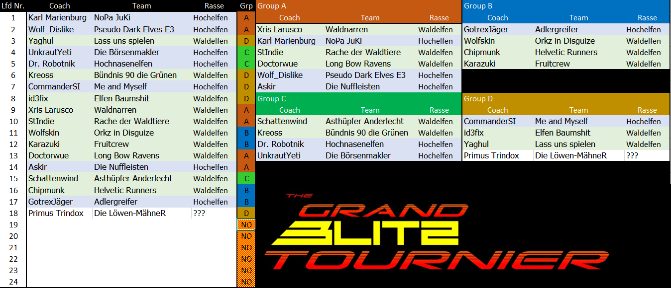Allerdings gilt es zu beachten, dass eine gerade Anzahl an Spielern benötigt wird, um die Saison ingame Spielen zu können. Es können daher noch eintrudelnde Anmeldungen nur sicher berücksichtigt werden, wenn sich ein zweiter Coach anmeldet.
