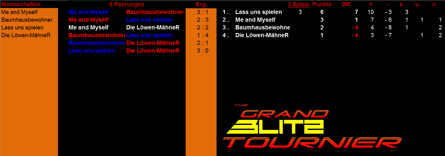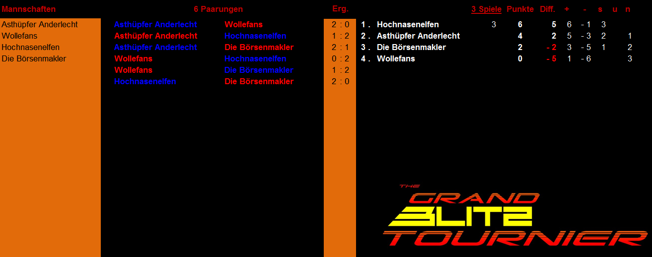 Weitere Anmeldungen sind natürlich noch möglich und gern gesehen. Zur Erinnerung, man kann auch mitspielen, wenn man bei den letzten Turnieren nicht dabei war.