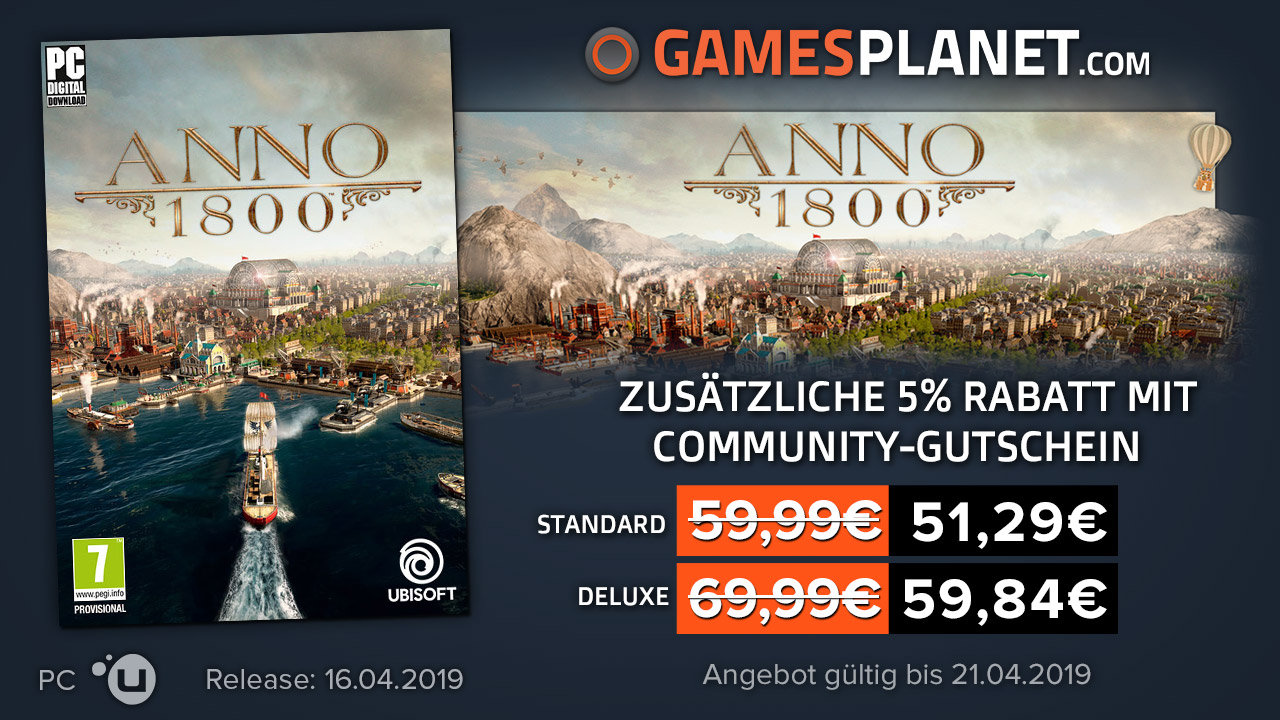 Das Release von Anno 1800 wurde auf den 16. April verschoben. Unseren Community-Gutschein bei Gamesplanet haben wir entsprechend aktualisiert.