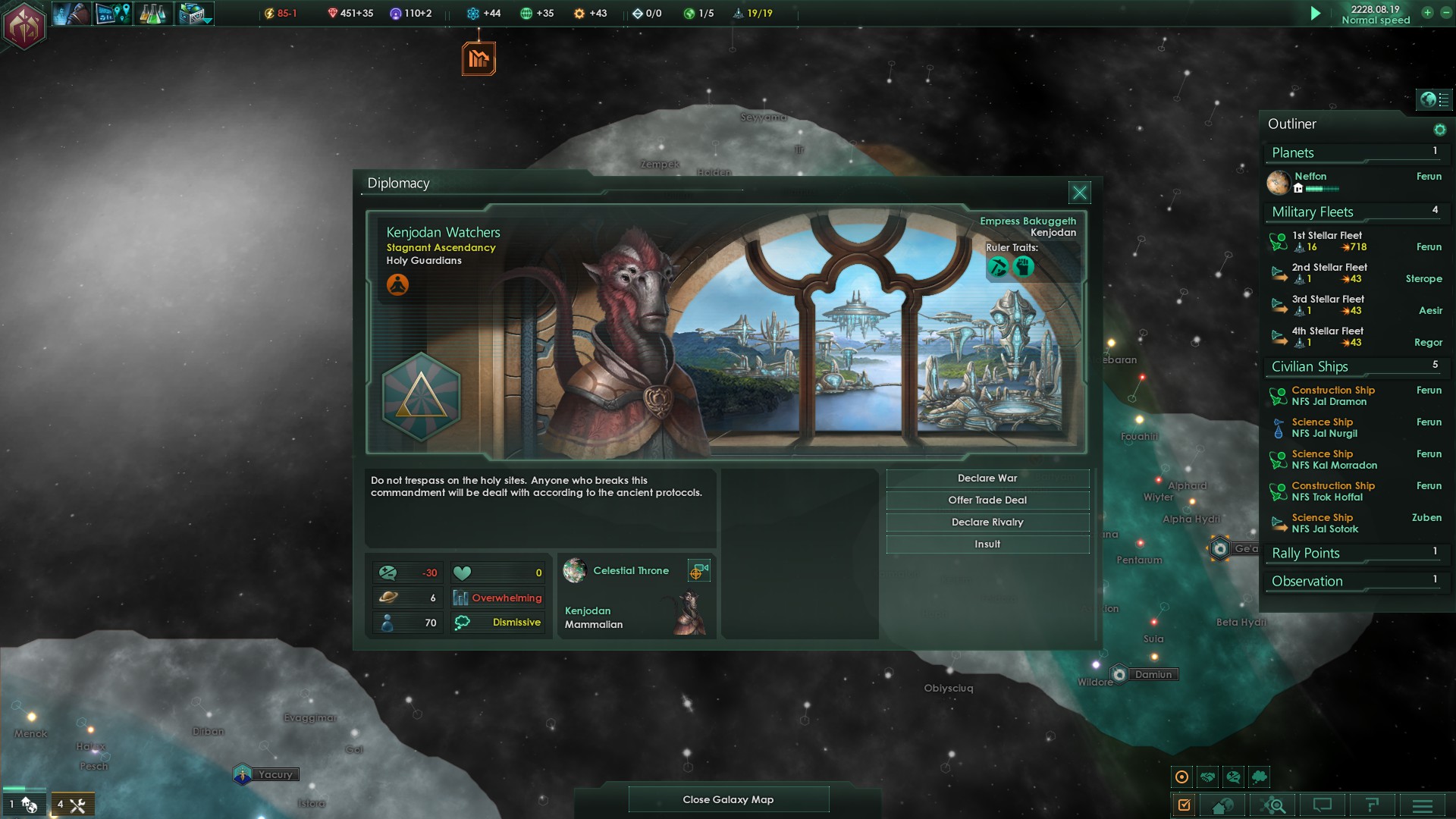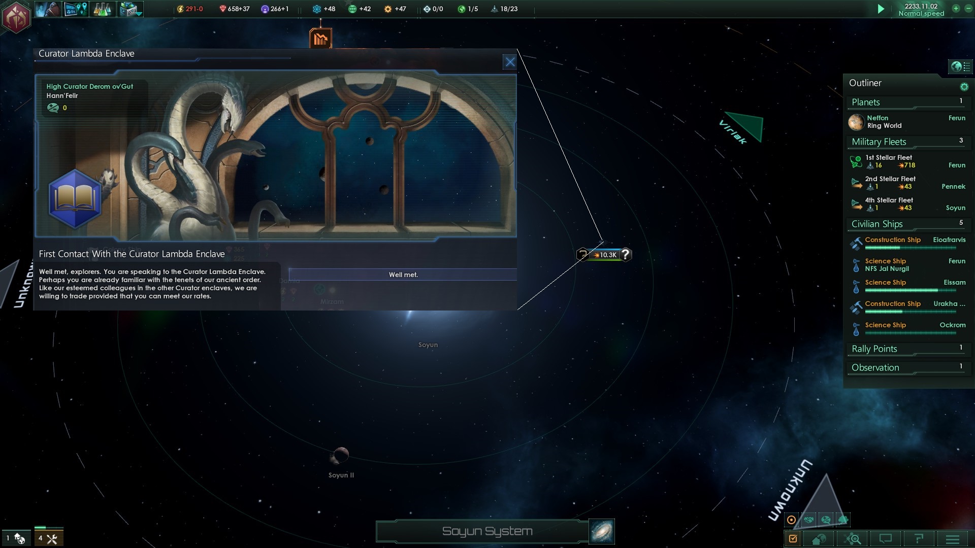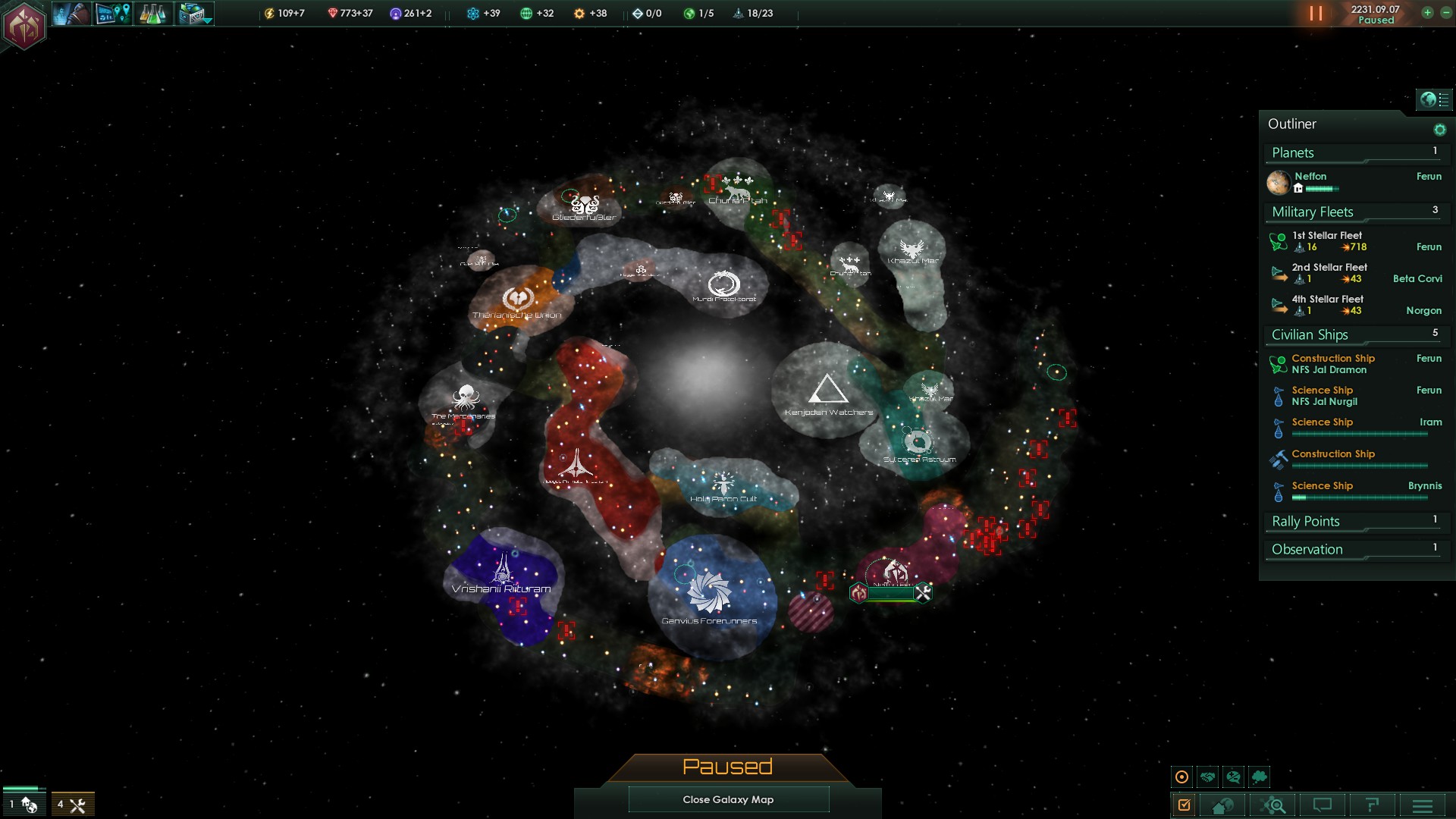 Zuerst wurden wir von einem Reich namens Kenjodan Watchers kontaktiert, ein extrem religiöses, dennoch weit fortgeschrittenes Volk, auf einem ähnlichen Entwicklungsniveau der Ganvius Forerunners.