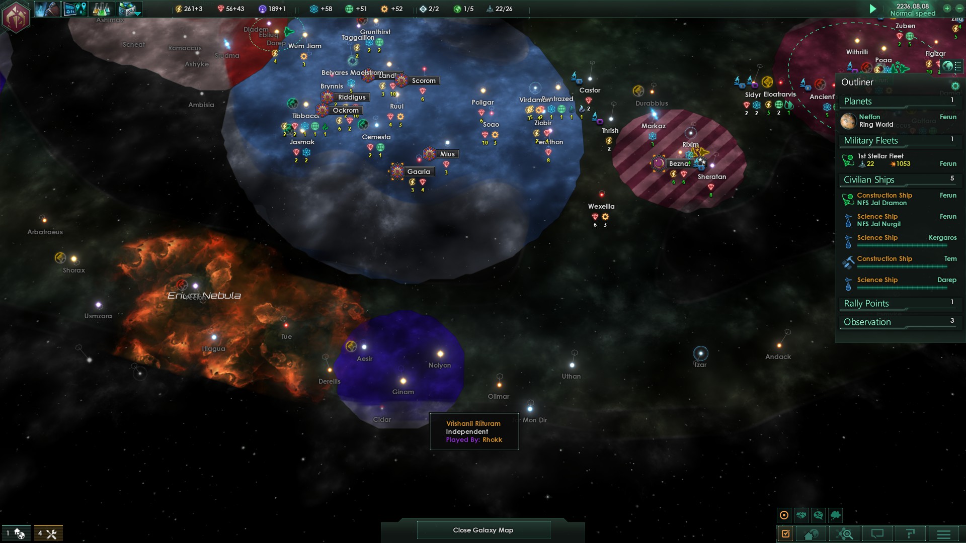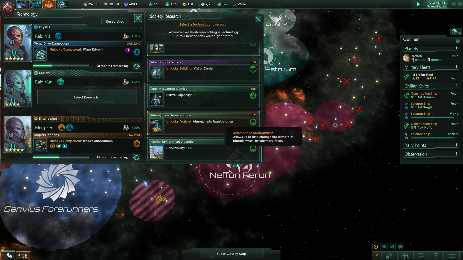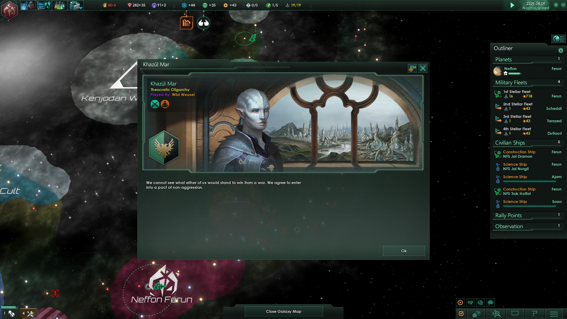 Zuerst wurden wir von einem Reich namens Kenjodan Watchers kontaktiert, ein extrem religiöses, dennoch weit fortgeschrittenes Volk, auf einem ähnlichen Entwicklungsniveau der Ganvius Forerunners.