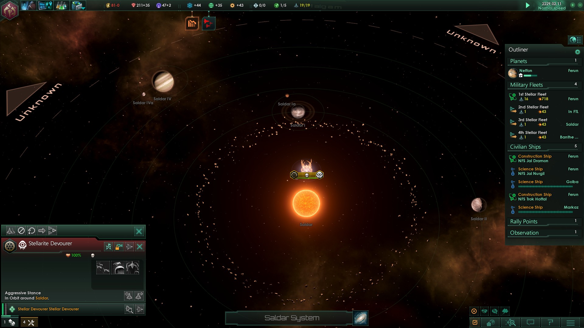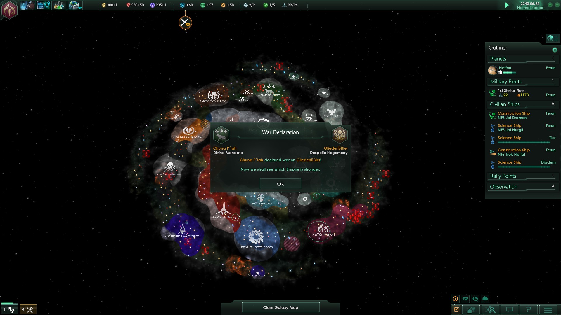 Wir konnten unsere Kooperation mit dem Heiligen Ammatar Imperium dagegen erfolgreich ausbauen und es kam zur ersten gemeinsamen Aktion unserer Flotten. 49 Kriegsschiffe der Ammatar flogen dazu in unser Gebiet ein und taten sich mit unserer Flotte zusammen.