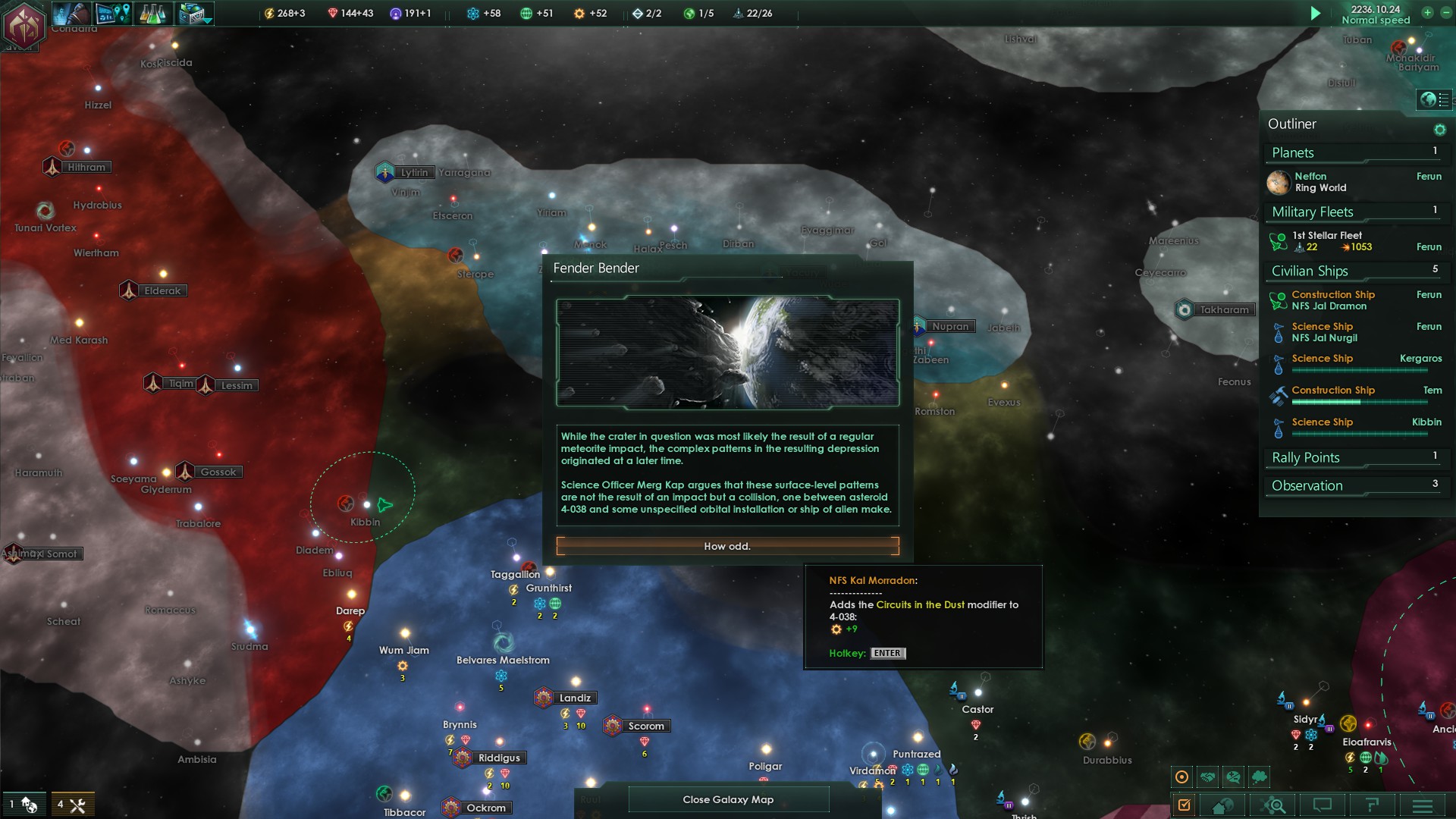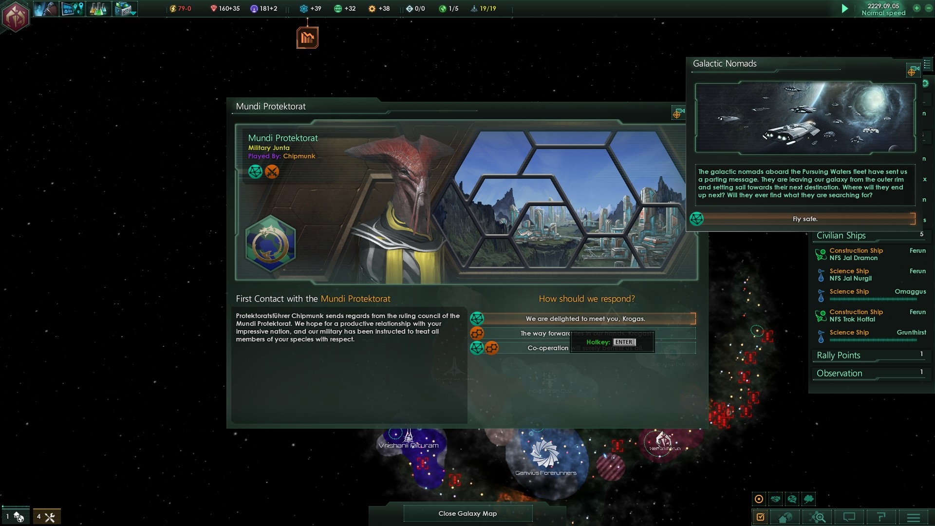 Zu diesen Kontakten sind auch erneut die Nomaden zu zählen, auch wenn diese lediglich bekanntgaben, aus nicht näher definierten Gründen weiter zu reisen und unsere Galaxie zu verlassen – gut, deren Schiffe sind zwar alt, aber erstaunlich wenig fortgeschritten und daher nurnoch von geringem Interesse für unser Volk.