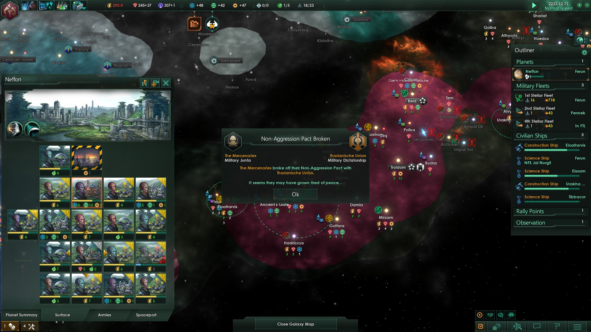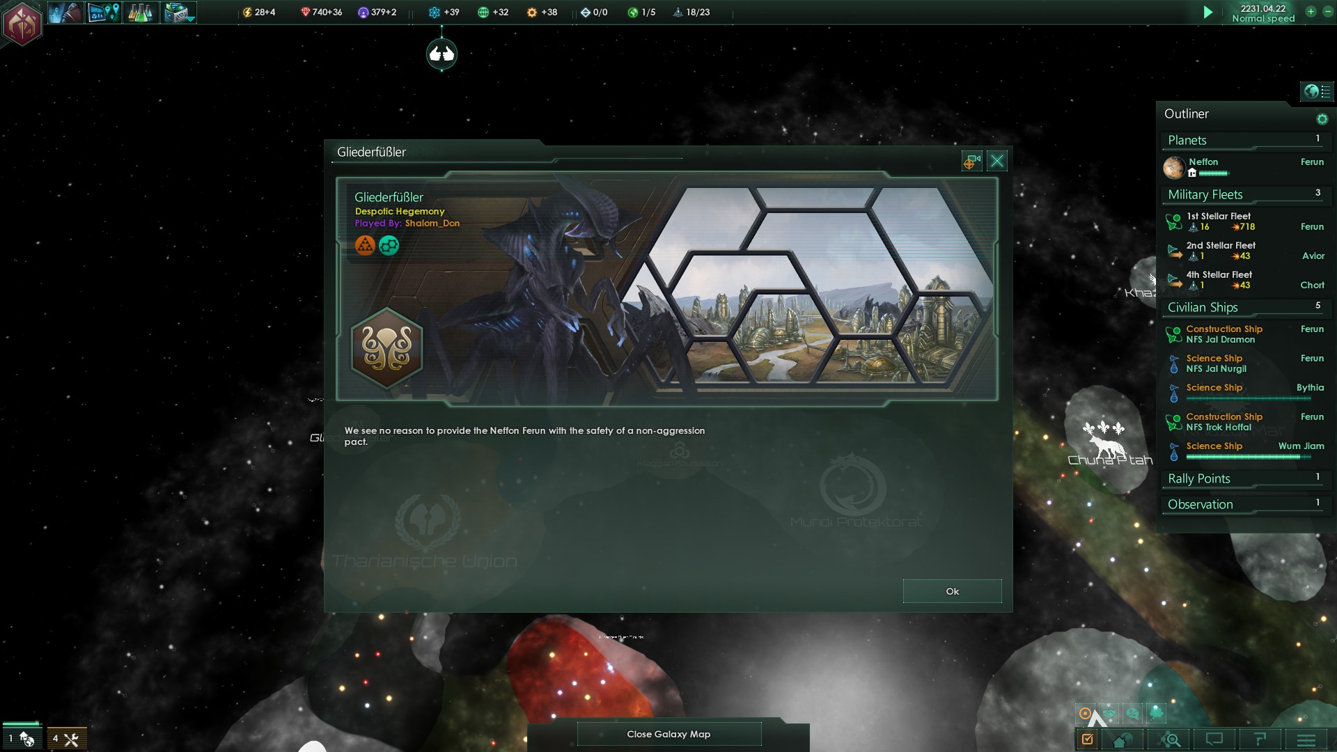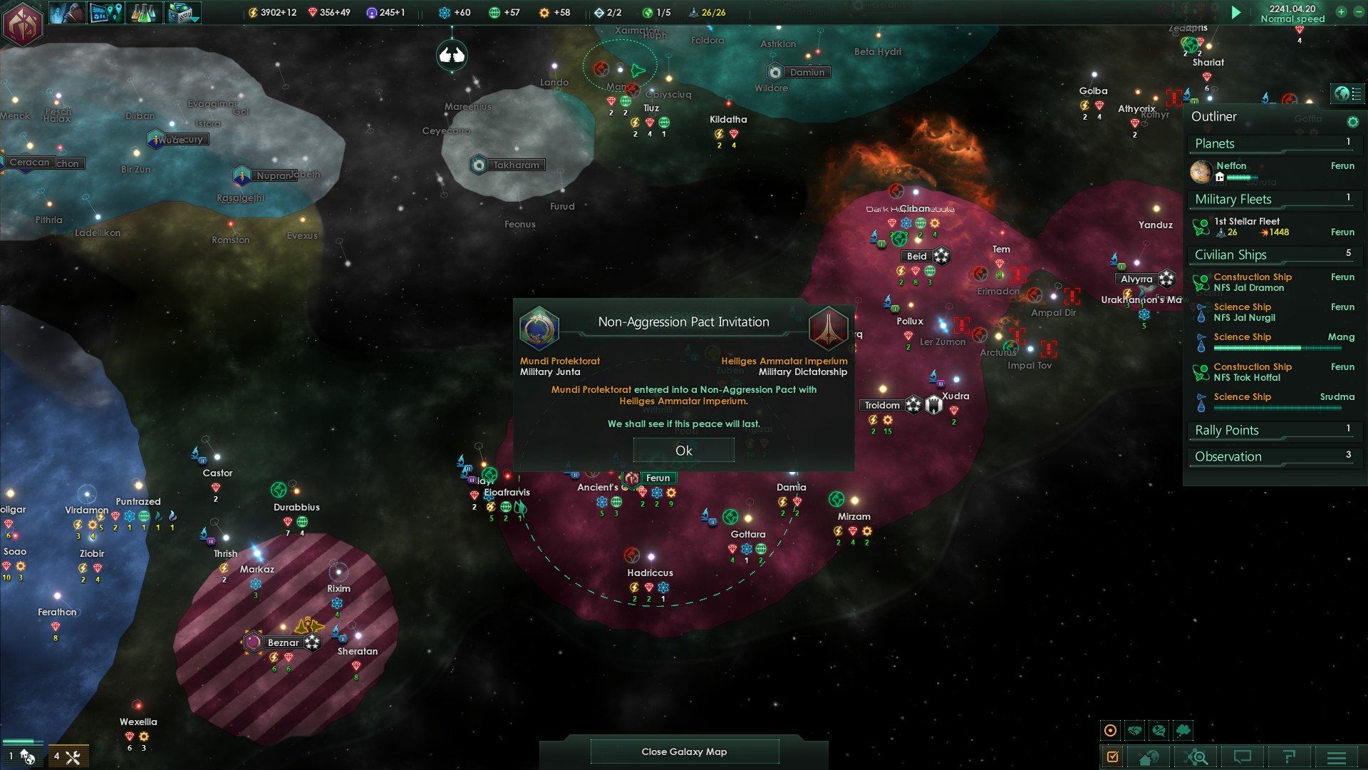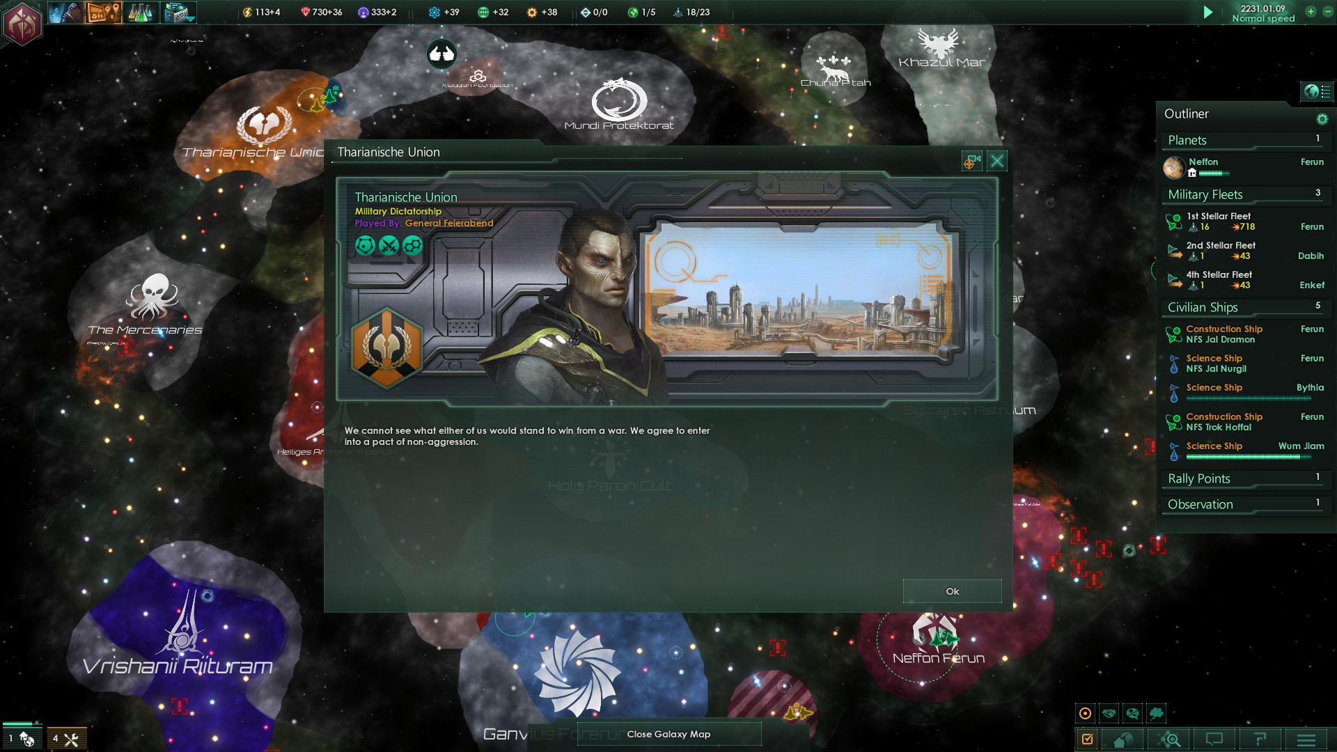 Zumindest konnten wir direkt einen Nichtangriffspakt mit den Söldnern abschließen, was Aktionen dieser gegen uns auschließen sollte. Ebenso konnte mit dem Mundi Protektorat ein Nichtangriffspakt geschlossen werden.