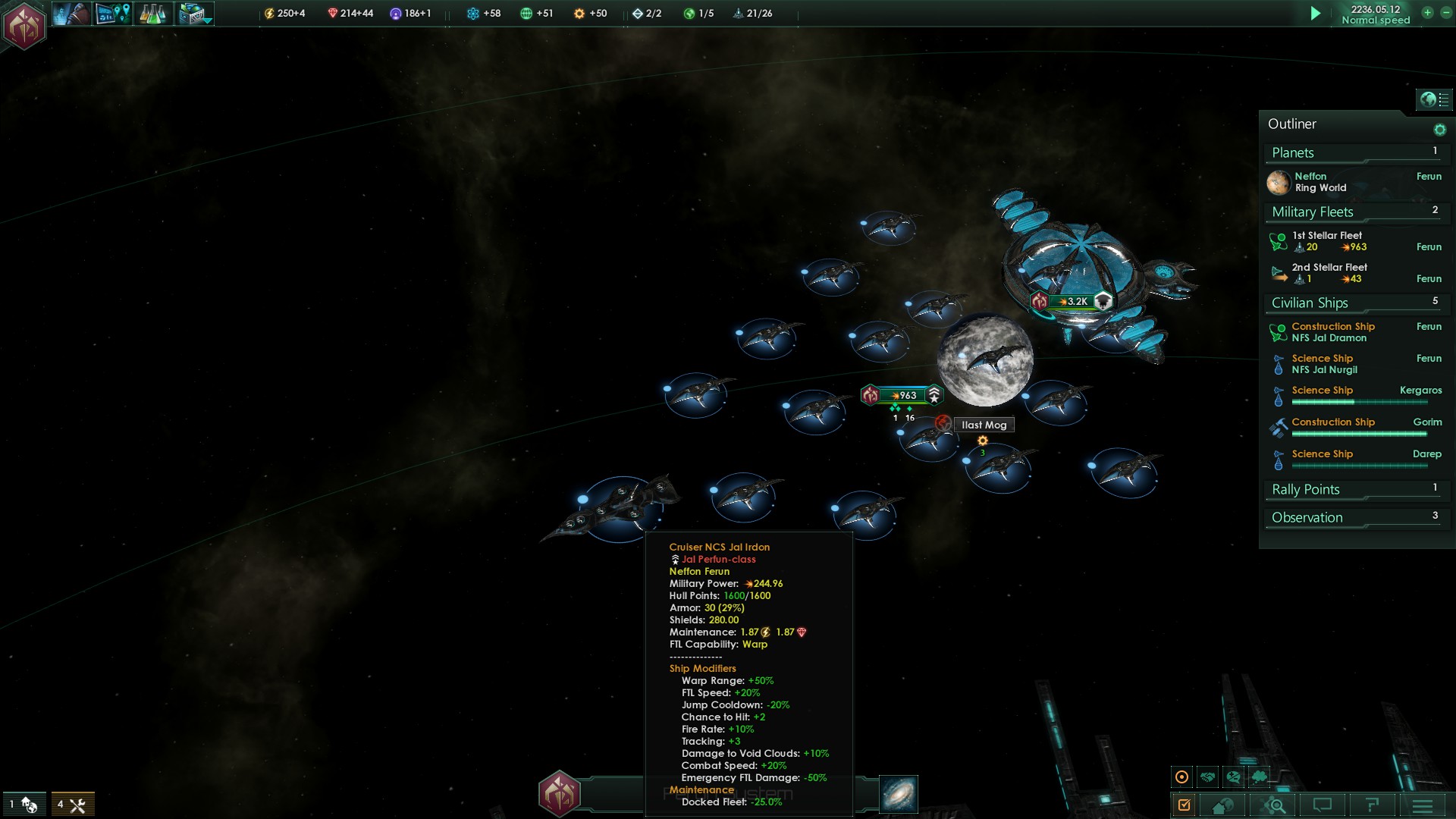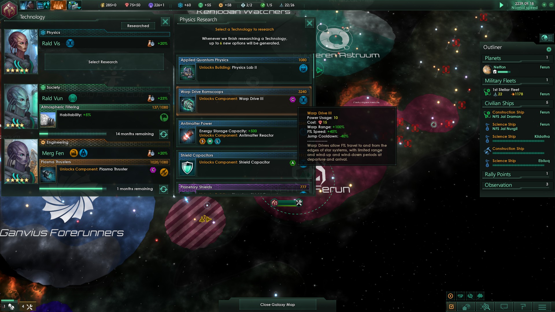 Unsere Wissenschaftler haben erneut eine Weiterentwicklung unseres FTL-Antriebs abgeschlossen. Damit sind wir mit unseren Schiffen nun schneller als jedes andere Volk. Gut, abgesehen von diesen beiden antiken Zivilisationen, aber bisher halten diese sich vollkommen aus der intergalaktischen Politik heraus.