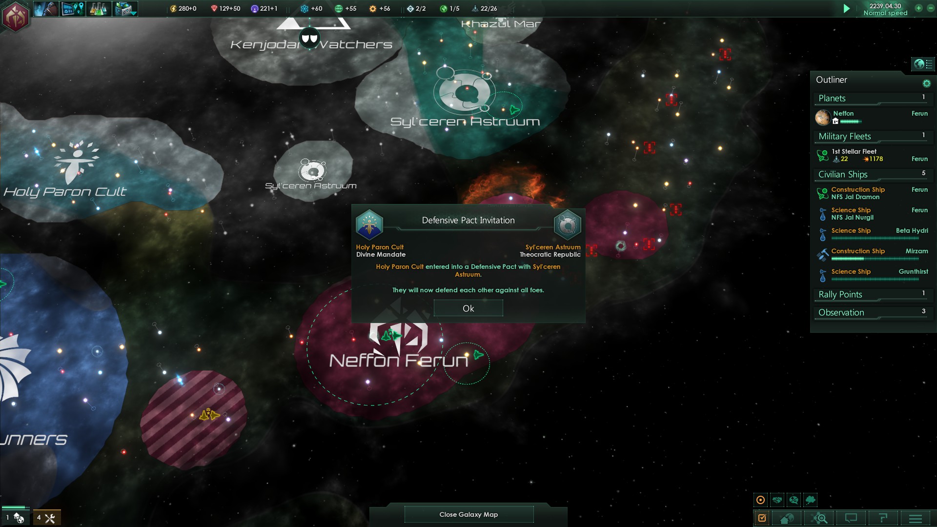 Die Antwort auf diese Rivalitätserklärung folgt daher auch prompt und der Holy Paron Cult schließt ein Verteidigungsbündnis mit den Syl´ceren Astruum.