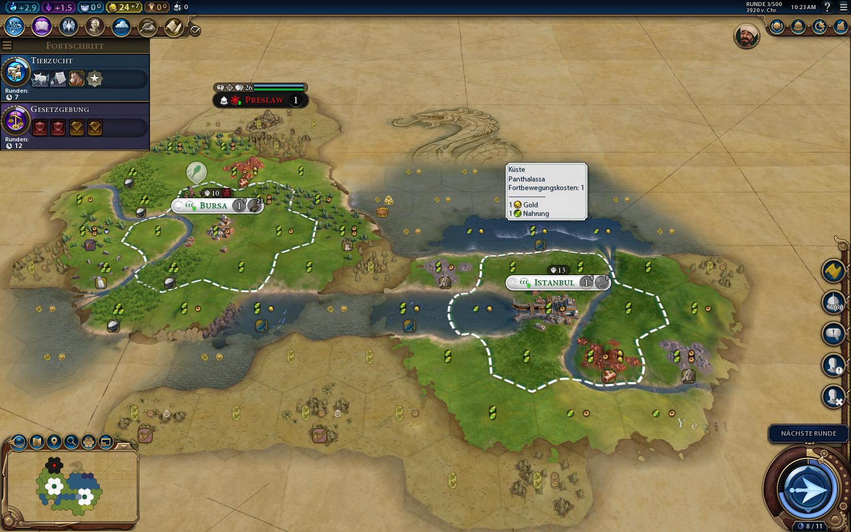 - Einheiten kann man auch gut kaufen - es sei denn man hat einen Produktionsbonus aktiv! Dann baue ich auch Galeeren, Schleuderschützen, Krieger etc. Wichtig bei Produktionsboni: möglichst veraltete Einheiten bauen in wenig Runden, um die Produktionboni nicht zu lange drin haben zu müssen. Das Aufwerten der Einheiten kostet dann zwar Geld, aber die Produktion ist entlastet - und mit Geld ist man meist günstiger (besonders mit Politkkarte und Staatsform)