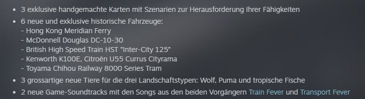 Die Deluxe Edition bietet neue Spielinhalte bestehend aus: Wer Transport Fever 2 bereits besitzt, kann mit Hilfe des das Spiel um die Inhalte der Deluxe Edition erweitern.
