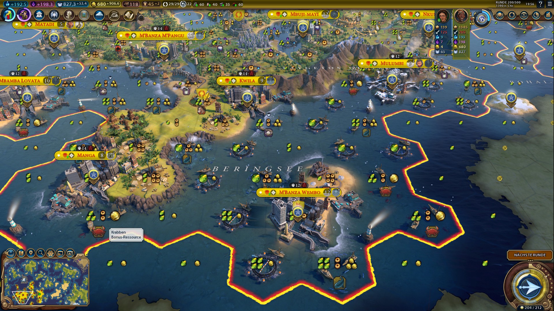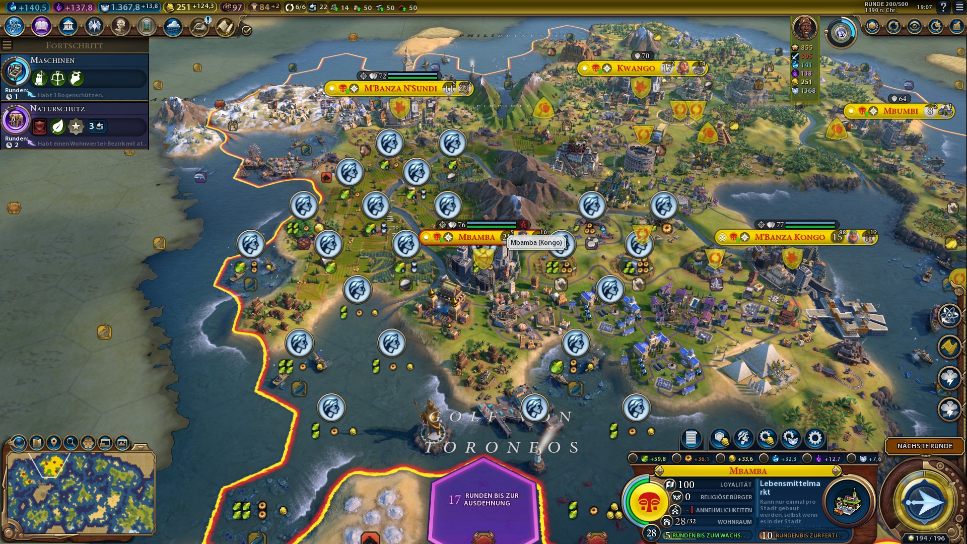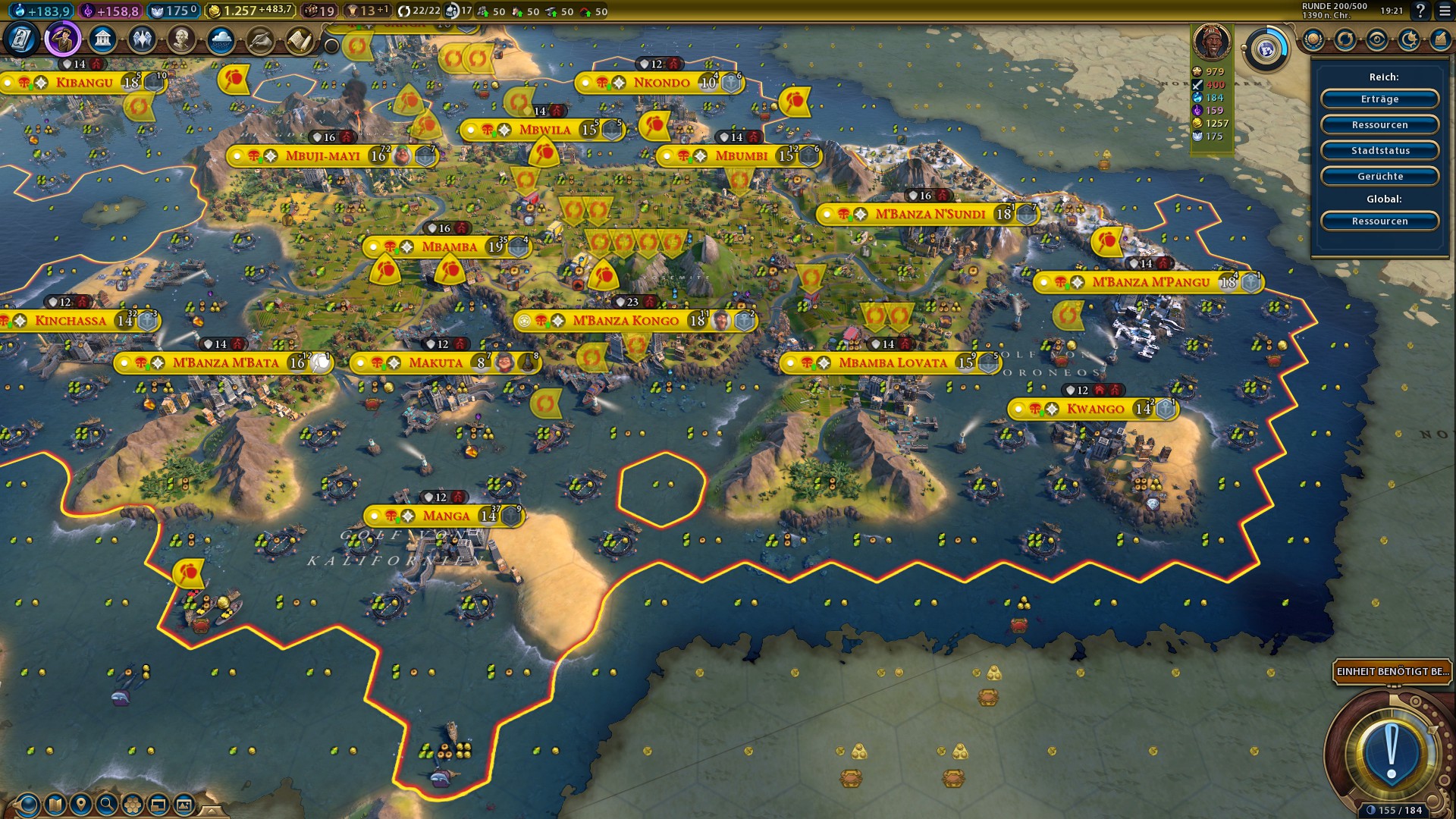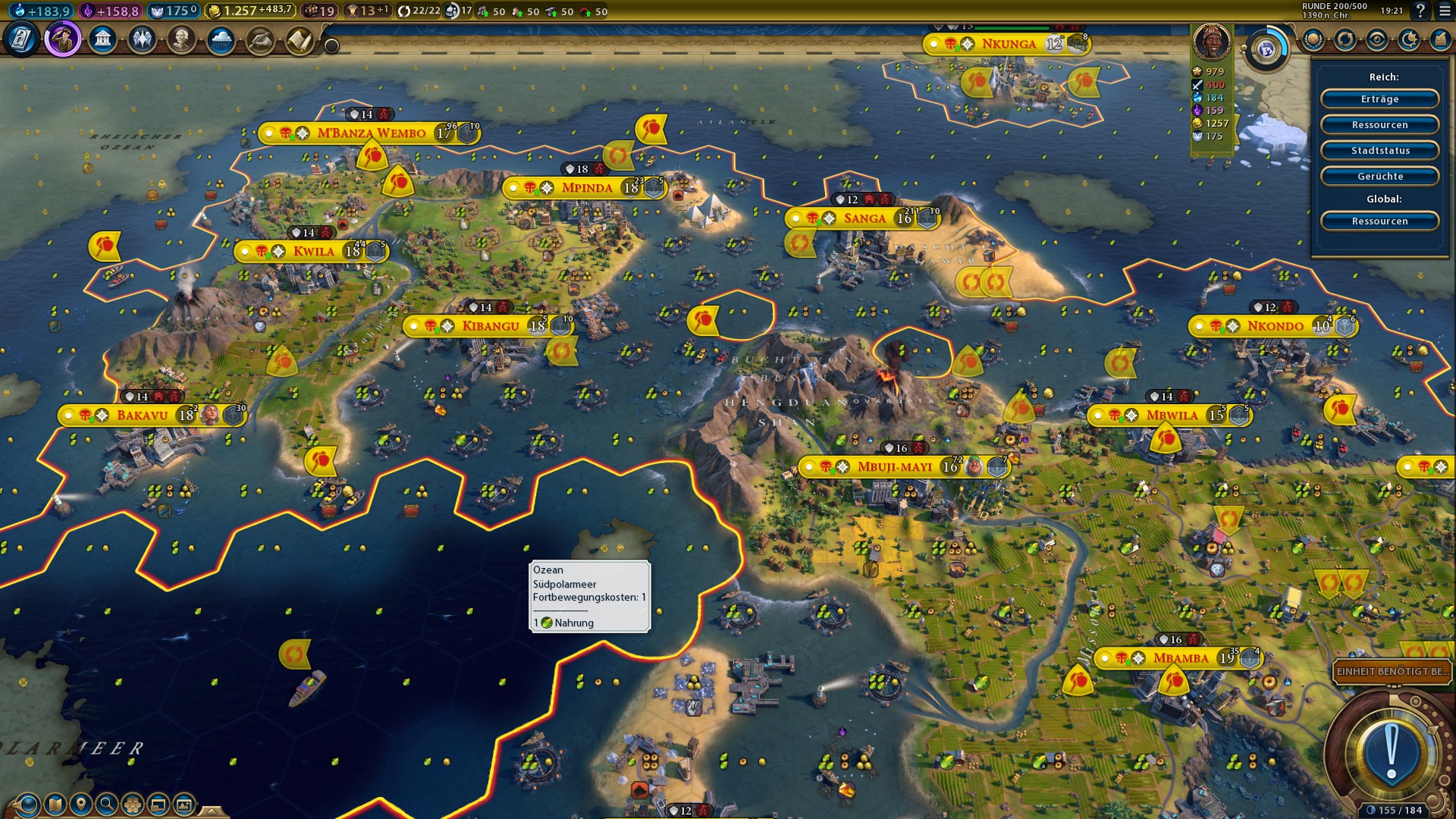 Gegen Ende wußte ich langsam nicht mehr, was ich noch bauen soll, um mehr Nahrung/Bevölkerung zu bekommen. Darum habe ich die Städte weiter mit Mbanzas geplastert, obwohl Wohnraum in Hülle und Fülle da war.