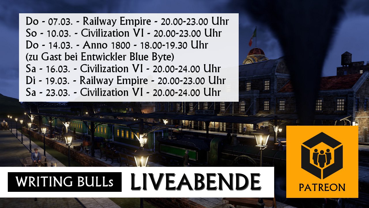 Ein dickes Danke an alle, die das durch ihren Einsatz auf Patreon geschafft haben! Ab sofort gibt es nun mindestens zwei Liveabende in jeder Woche. Diese Woche sogar drei. Dienstag, Mittwoch und Samstag ab 19.30 Uhr. Und womit? Tatarataaa... ... mit Anno 1800! 8-)