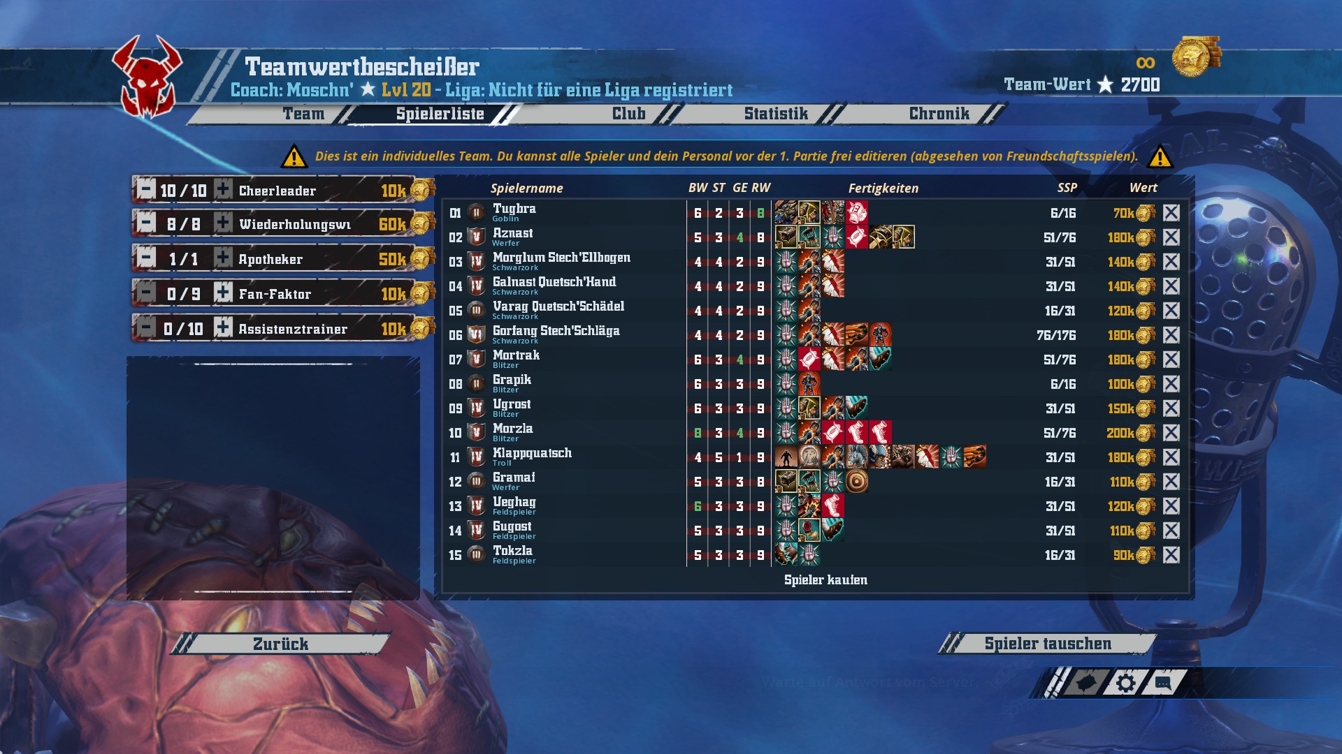 Ich hab mal ein Team erstellt und schon ein paar spiele gemacht und muss in der jetztigen Liga gegen meinen nächsten KI-Gegner ran und ich habe mich über seine Skills und den dazugehörigen Teamwert gewundert, ist das noch ein Bug oder muss die KI das so machen um den Schwierigkeitsgrad zu erhöhen?