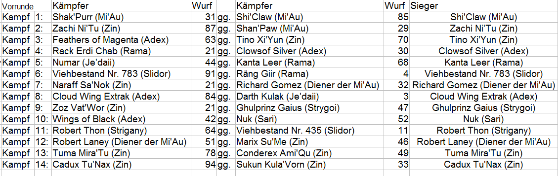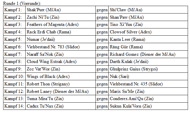 Kampf 14: Im letzten Kamf den heutigen Tages erwartet uns ein Kampf zwischen den Häusern Zu'Nax und Kula'Vorn. Cadus Tu'Nax trägt ein Dusoma, Sukun Kula'Vorn zwei Kaduba. Beide stammen nicht aus den Königsfamilien sondern aus der Leibgarde der Königshäuser. Mühelos kann Cadux allen Angriffen von Sukun ausweichen oder parieren. Er wartet mit seinem angriff auf den richtigen Moment. Als dieser endlich kommt wird Sukun erst der eine Arm und gleich darauf folgend der andere abgetrennt. Es folgt nun ein Stich in Herz um es zu beenden.