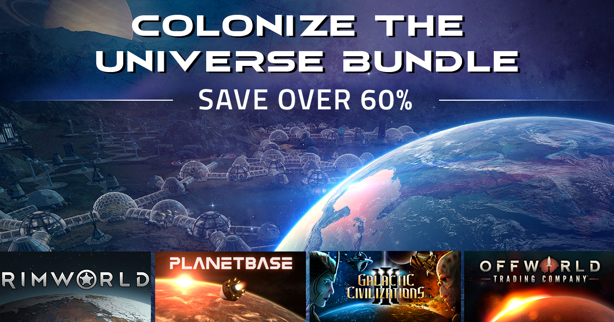 Unter dem Motto "Kolonisiert das Universum!" bekommt ihr die vier Sci-Fi-Games Rimworld, Planetbase, Offworld Trading Company und Galactic Civilizations 3 im Paket für gerade mal 39,99 Dollar, also etwa 34 Euro. Mehr Infos zu den Spielen und eine Kauf-Möglichkeit gibt es über meinen Shoplink.