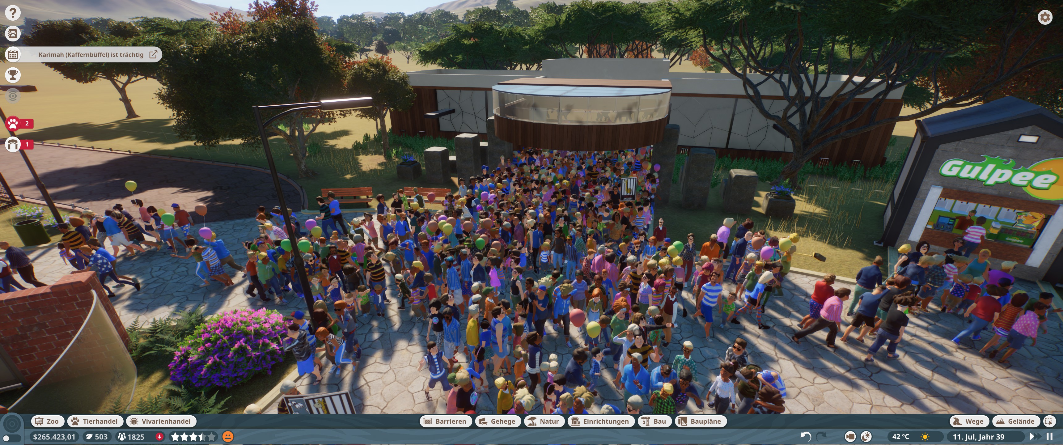 Diesen Screenshot muss ich einfach hier mal zeigen...ich hatte den Zoo kurzzeitig wg. Marketing und Arterhaltung auf 4 Sterne gebracht...plötzlich ist der gesamte Eingangsbereich vollkommen überfüllt. Es strömt nur so herein...