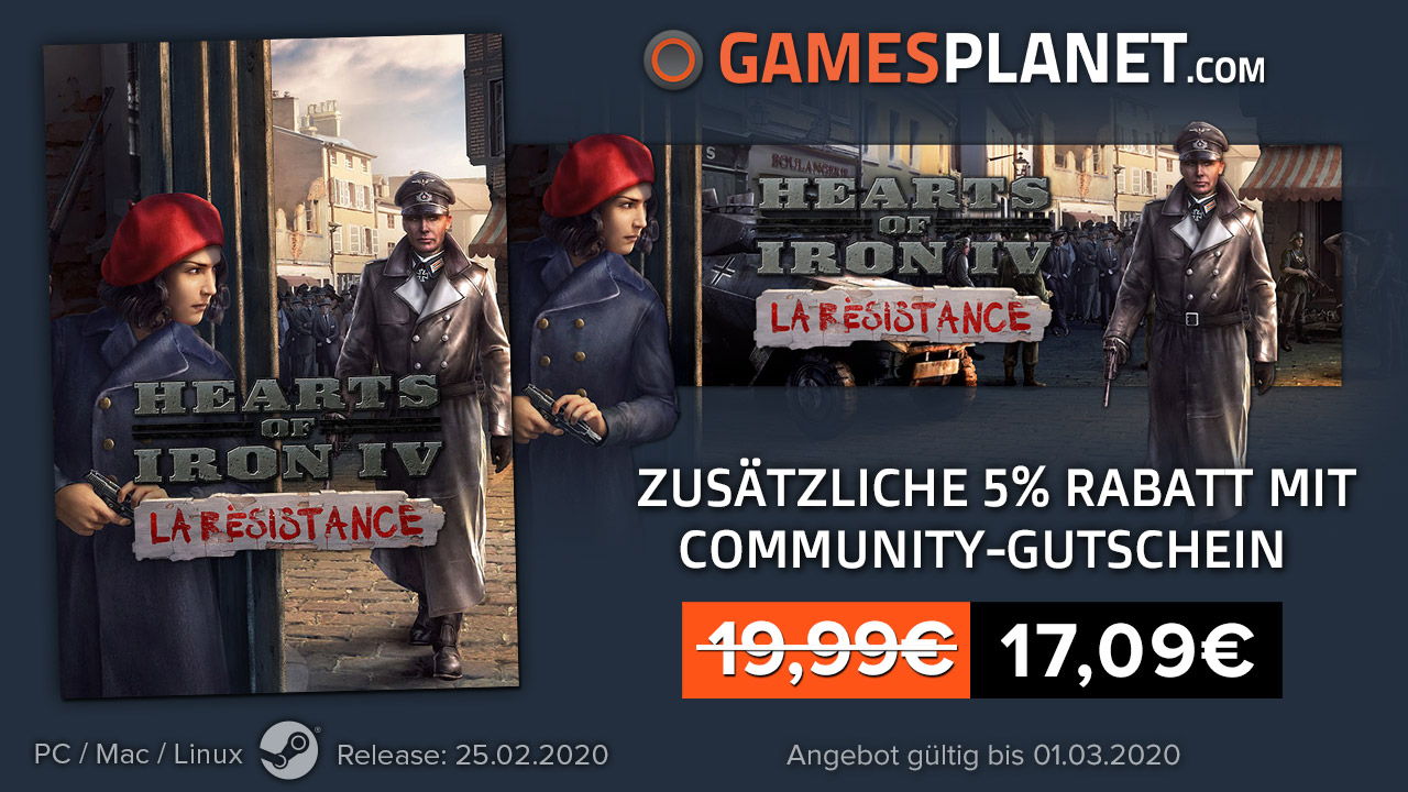 Am 25. Februar erscheint La Résistance, der neue DLC für Hearts of Iron 4. Wie gewohnt, gibt es dafür einen Community-Gutschein bei Gamesplanet, der beim Kauf Zusatzrabatt gibt.