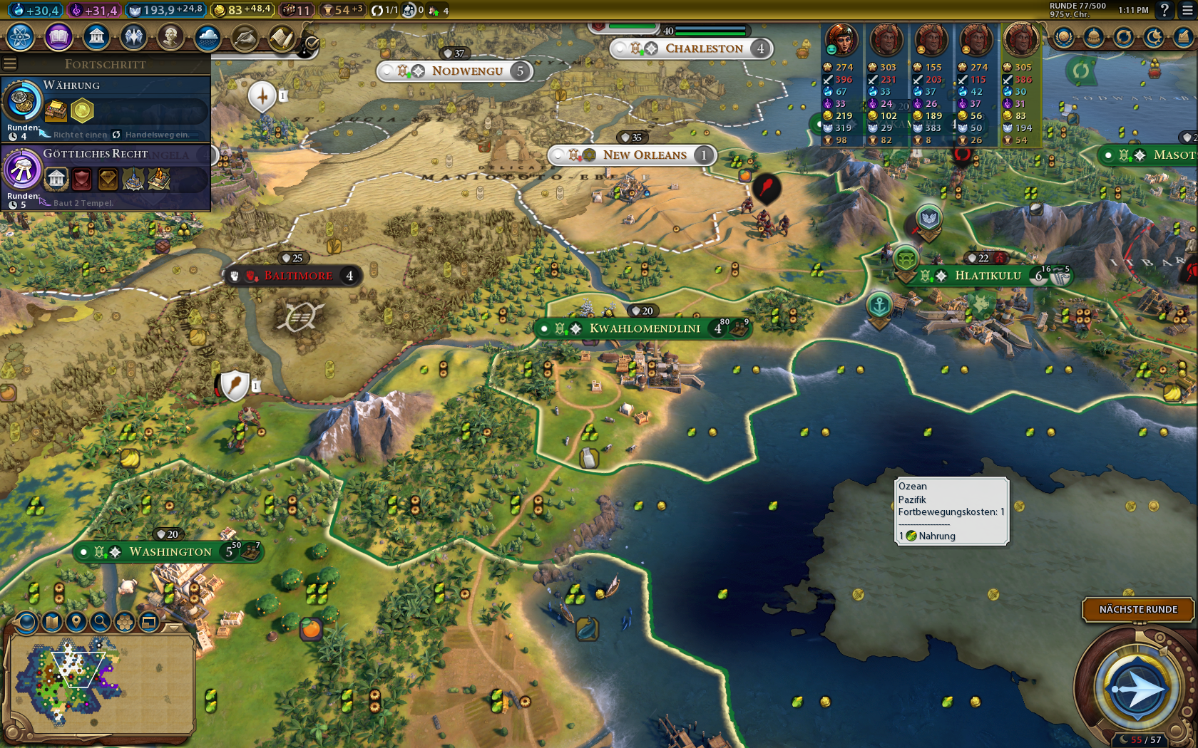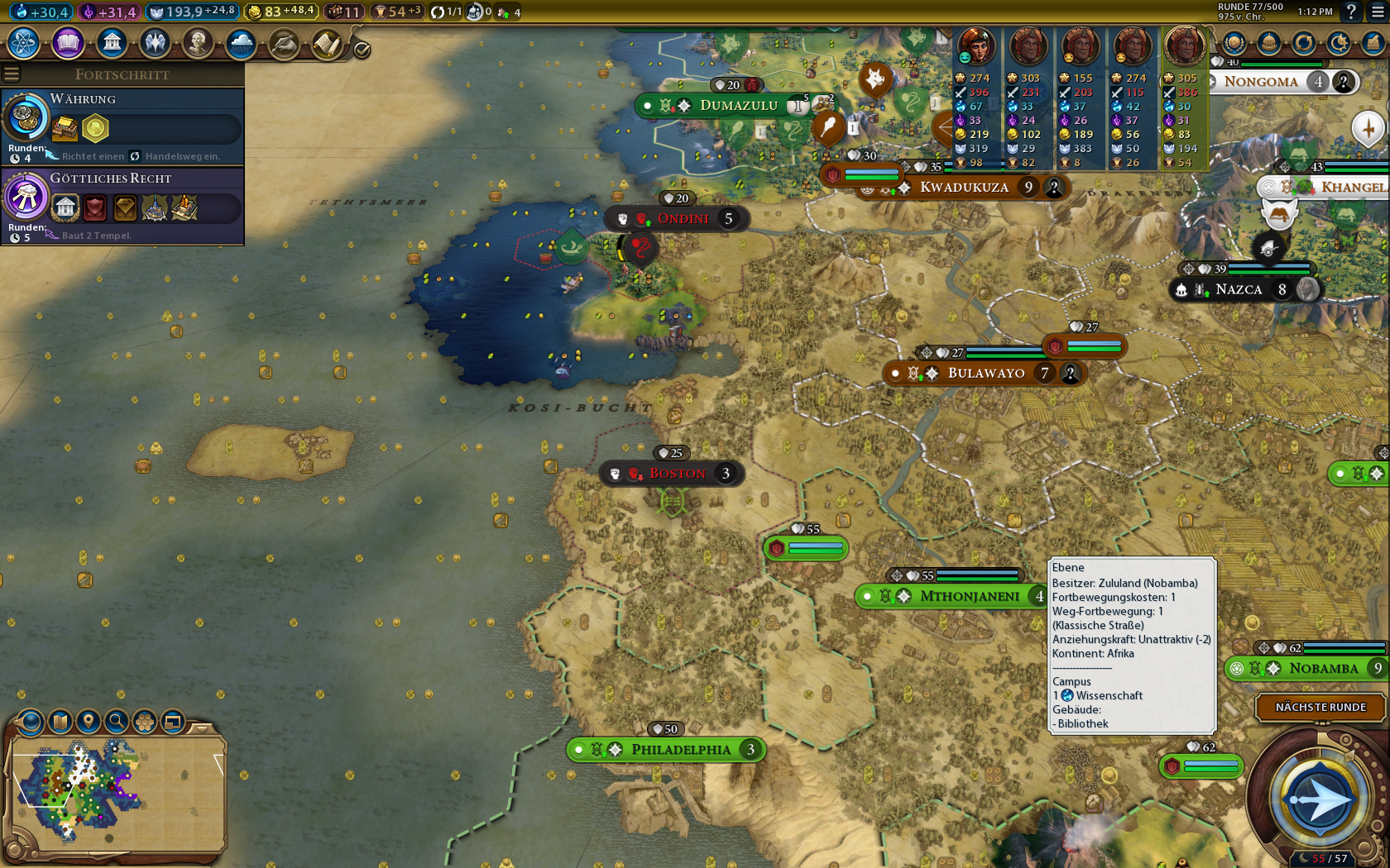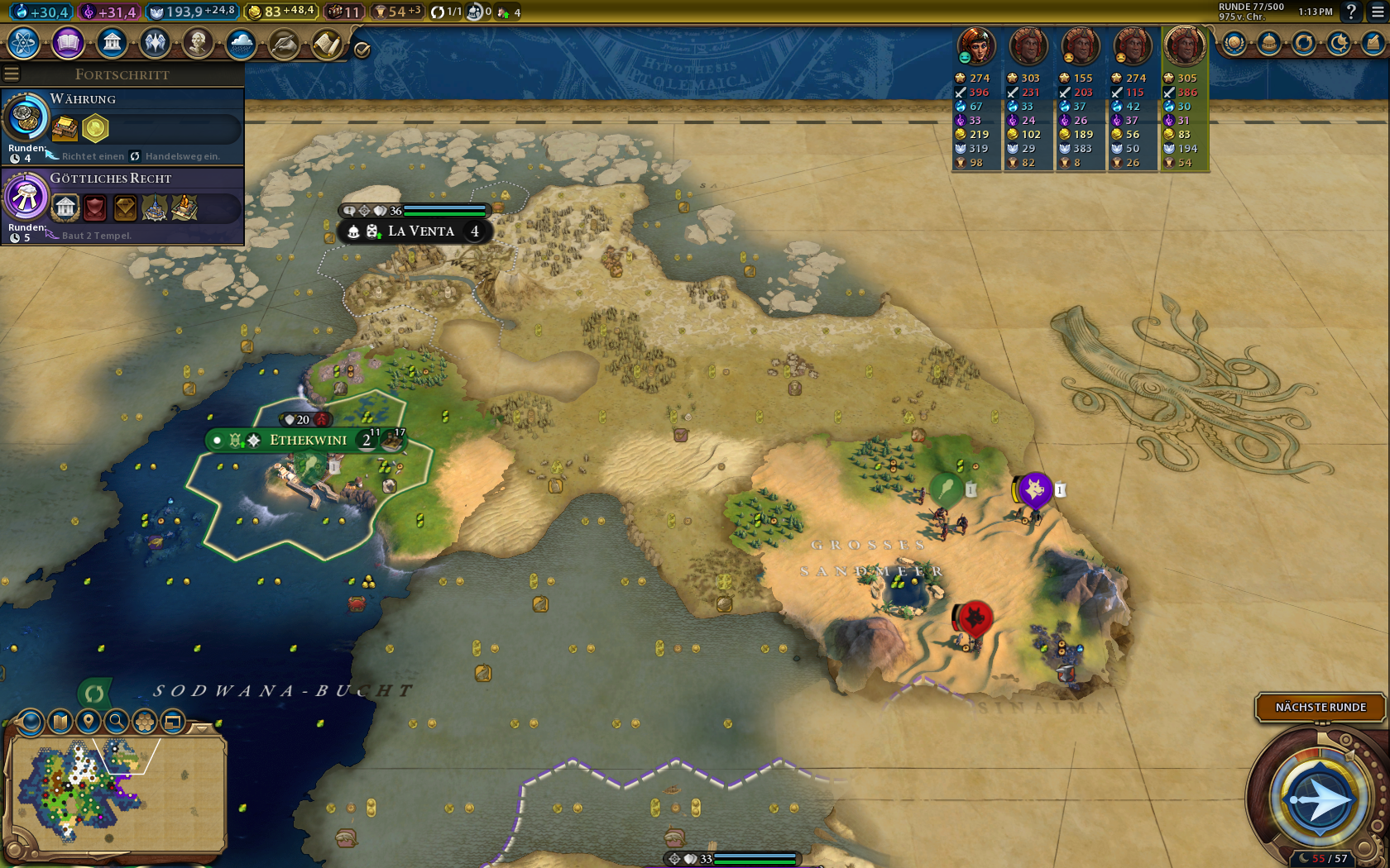 Meine Schiffsflotte für einen Seekrieg hing leider an den Stadtstaaten/Eis fest und konnte keinen einzigen Feind besiegen - immerhin entdeckte ich so den Ägypter und ganz am Ende noch den Kongo.