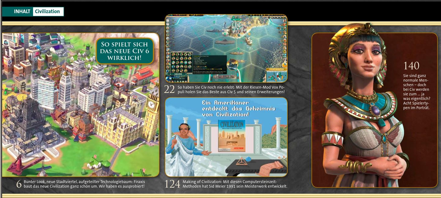 Hier gibt's für euch schon mal das Inhaltsverzeichnis zu sehen. Schwerpunkt des Heftes sind Infos zu Civ 5, insbesondere zu guten Mods und zu Multiplayer-Spielen. Dazu kommen Vorberichte zu Civ 6 und einige Artikel über das Phänomen Civilization. Ich freue mich sehr, dass viele Artikel aus unserer Community und dem Kreis der Präsentatoren des YouTube-Kanals beigesteuert wurden.