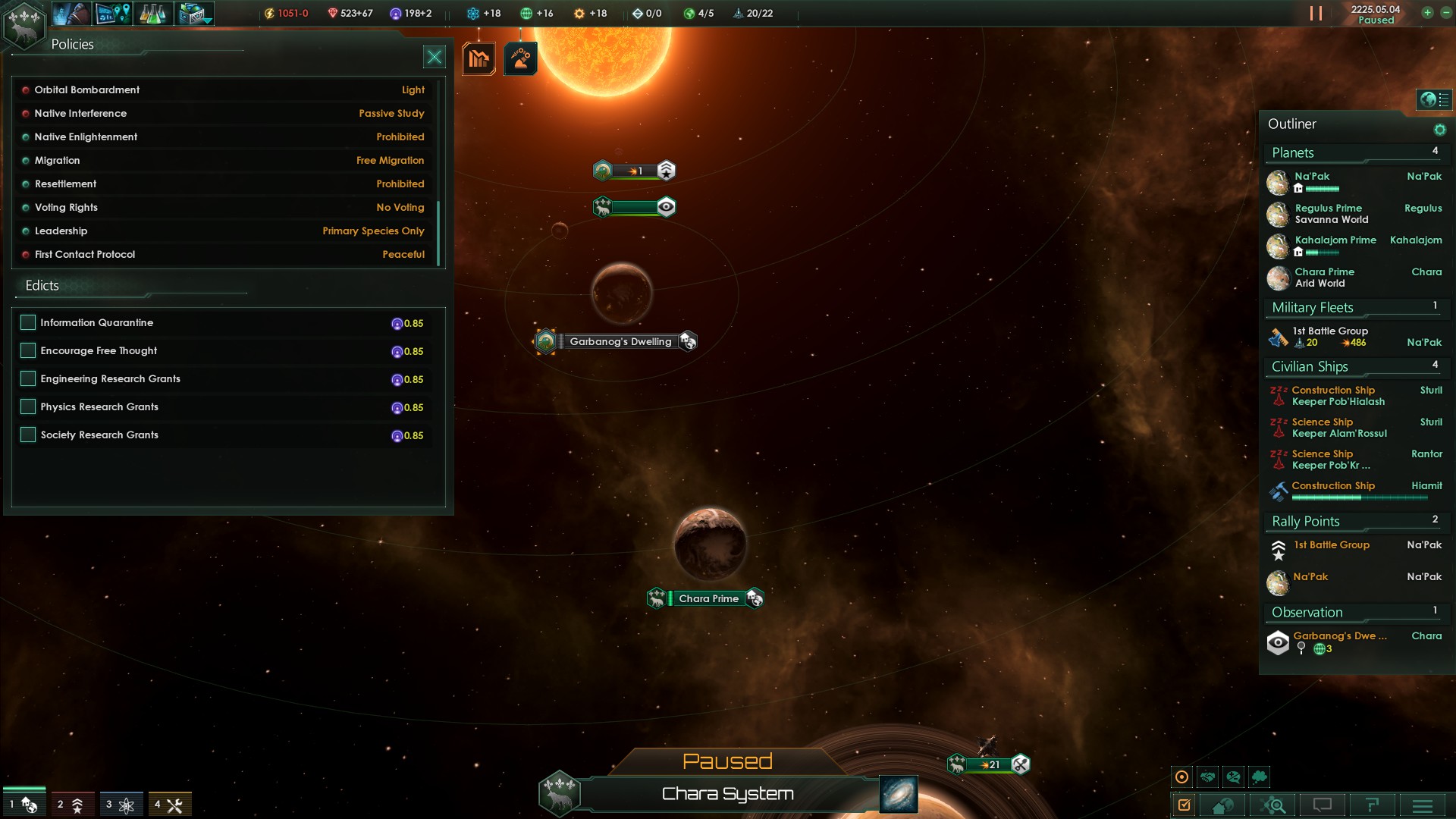 In der Zwischenzeit fanden wir auch noch zwei weitere Zivilisationen. Die Gliederfüßer und die Kenjodan. Beide waren beim Erstkontakt eher kühl und abweisend. Die Kenjodan warfen uns auch direkt aus ihrem Gebiet. Die Gliederfüßer hatten kein Problem, wenn wir ihre Systeme bereisten. Daher taten wir das auch und statteten insbesondere ihrem Heimatplaneten einen besuch ab. Dort mussten wir erfahren, dass bei den Gliederfüßer Sklavenhaltung als völlig normal angesehen wird. Wir wiesen sie darauf hin, dass wir dieses Verhalten nicht für gut heißen können und es nicht tolerieren, wenn sie auch andere Spezies versklaven. Die Gliederfüßer werden seit dem von uns ständig genau beobachtet.